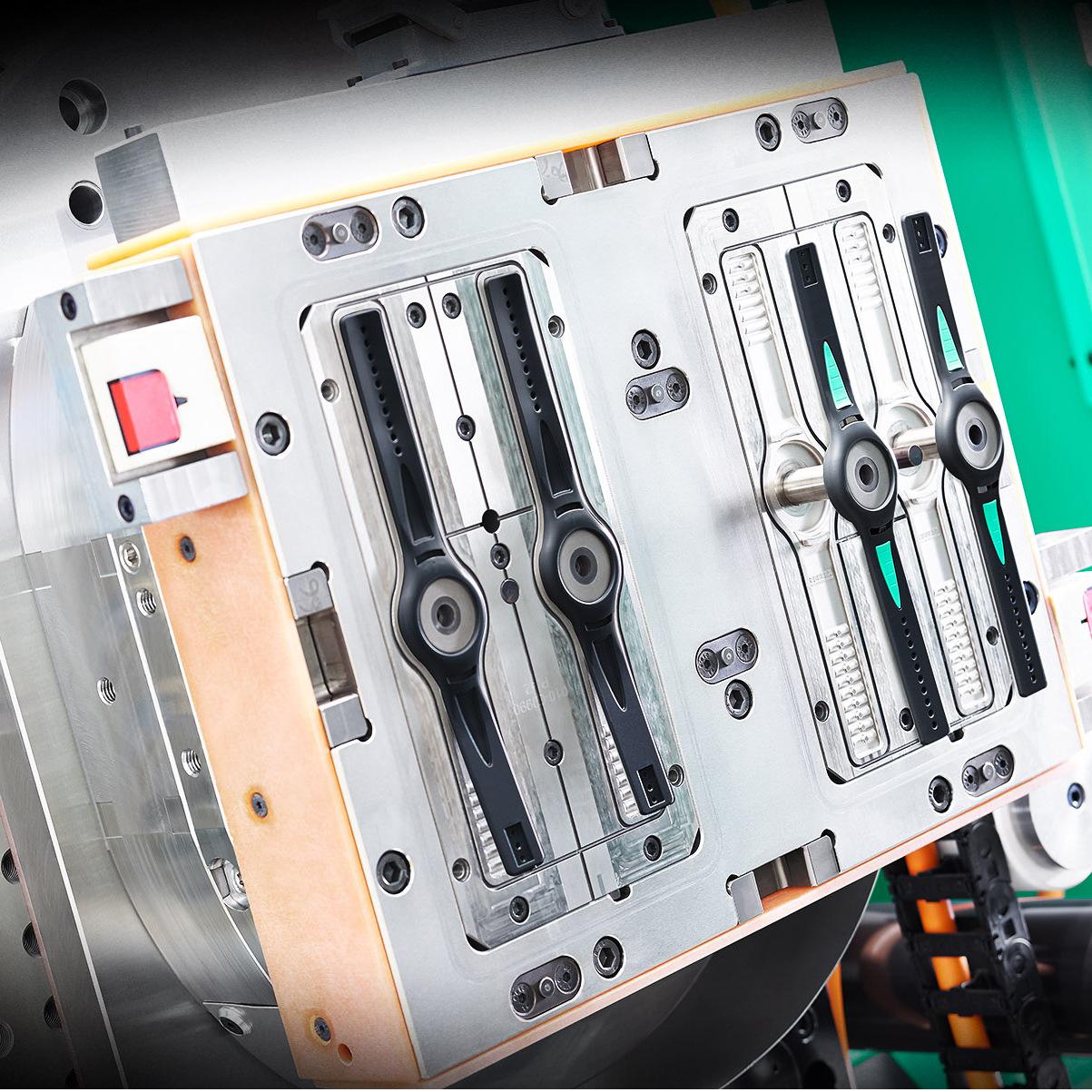 雙色表帶注射成型通過模具合模后先注射單邊顏色完成注塑成型后,將模芯替換在進行二次注射成型達到雙色效果,同時達到完全不分色不分線的效果。