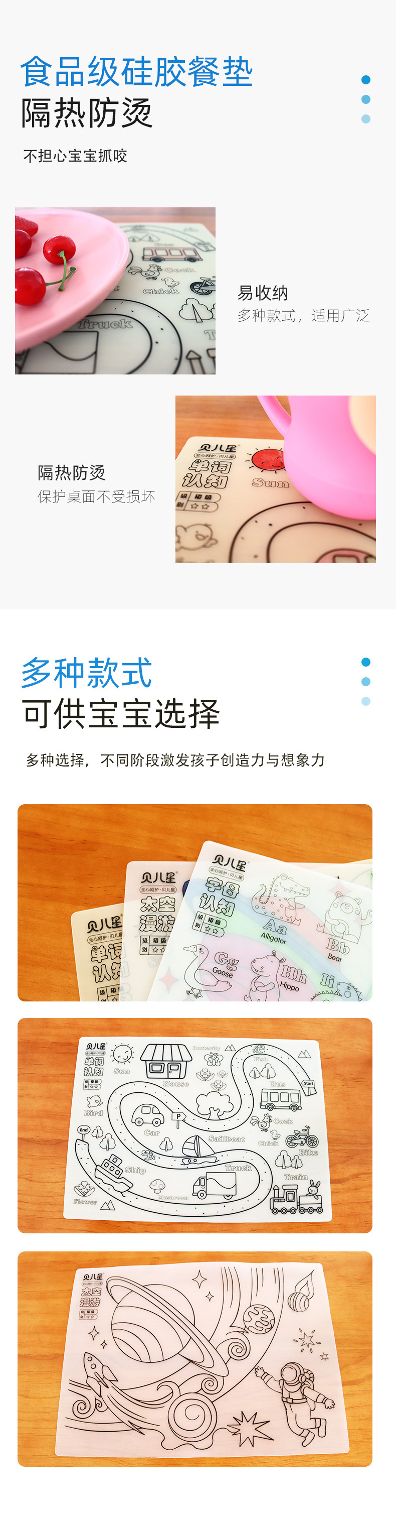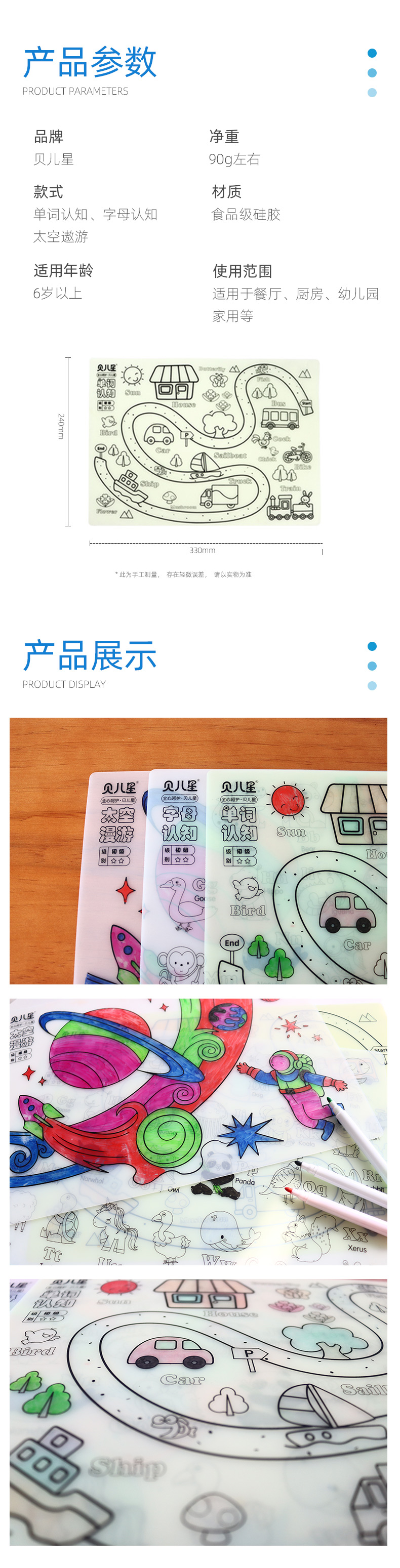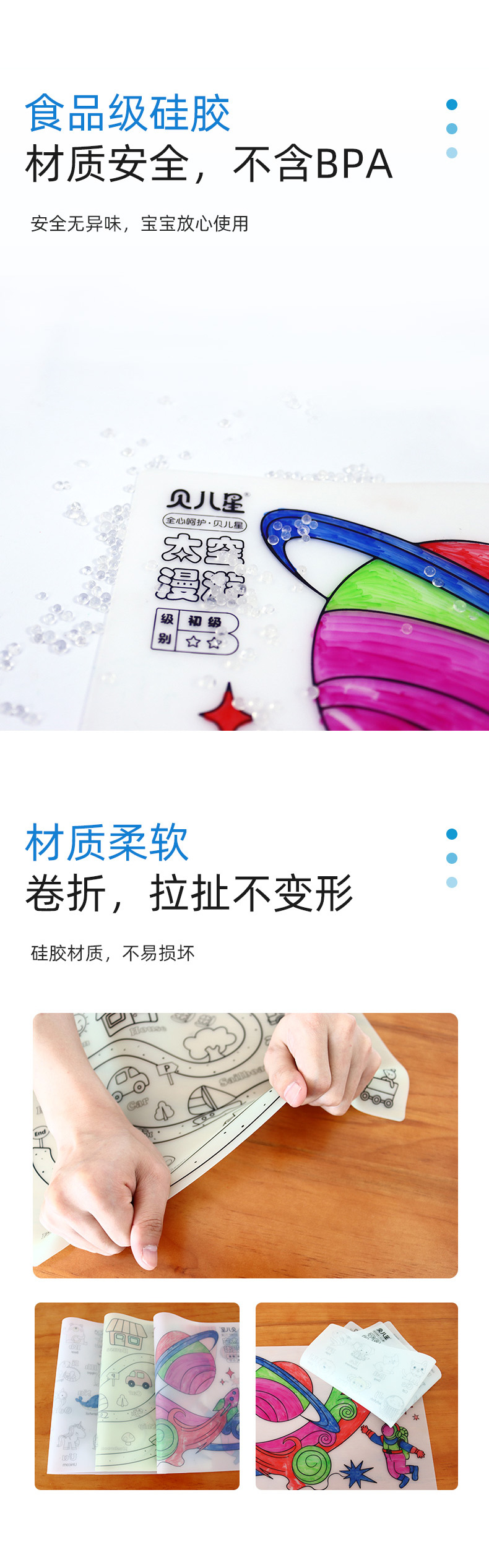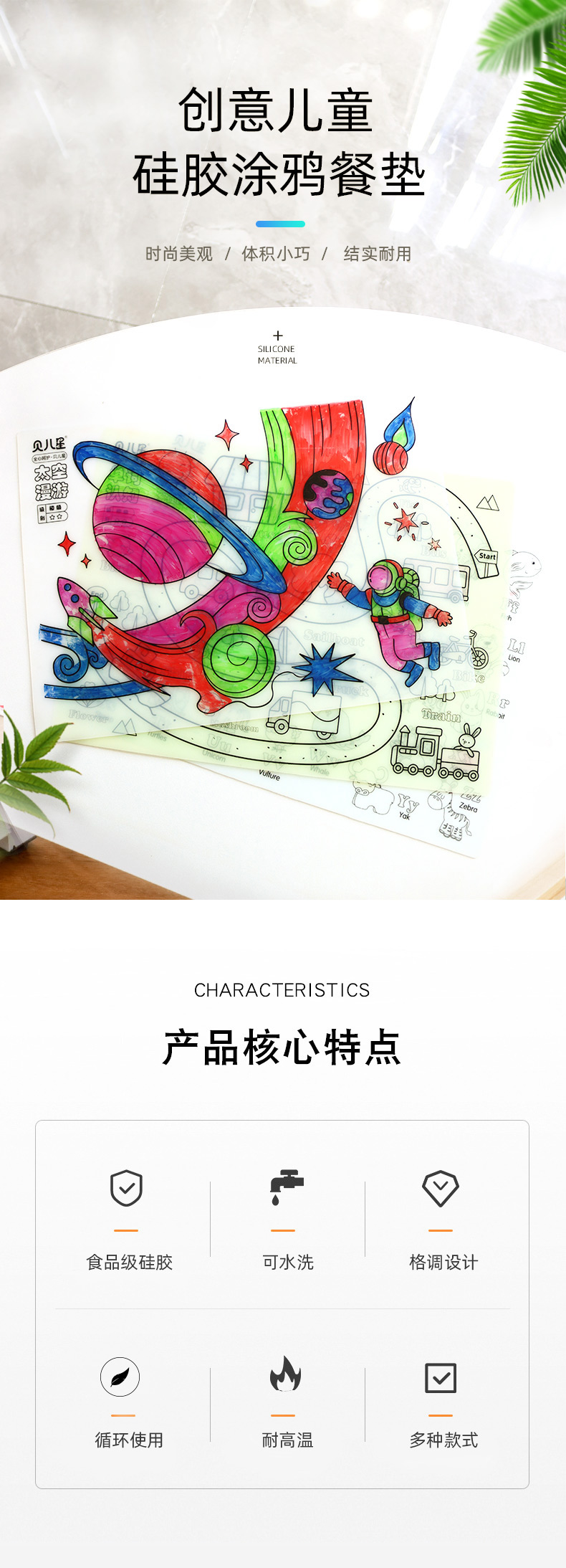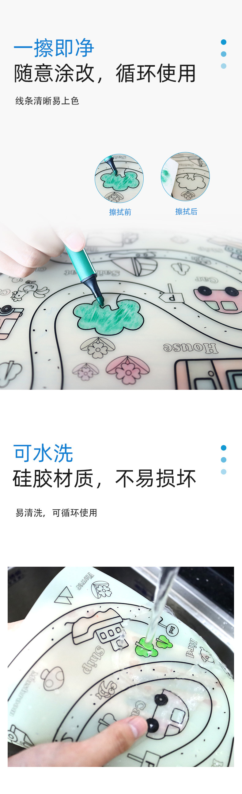 硅膠涂鴉畫板產(chǎn)品的主要買點源于產(chǎn)品的表面圖案以及配套的創(chuàng)意,產(chǎn)品從6-12歲之間具有不同的主題與認知圖案,可以連接整體進行學習提升大腦開發(fā),加強兒童動手能力以及創(chuàng)新創(chuàng)作能力,此外產(chǎn)品配比水性可清洗彩色筆,不會對硅膠表面產(chǎn)生筆污以及筆畫痕跡,材料屬于柔軟回彈食品級硅膠,所以硅膠店鋪可以任意曲折來回折疊不會變形損壞,此外硅膠墊片可水性可隔熱,可耐高低溫,可以在多個行業(yè)領(lǐng)域當中運用!