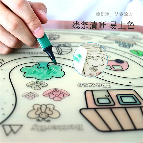 材料環(huán)保柔軟,硅膠墊廠家采用優(yōu)質(zhì)食品級硅膠材料生產(chǎn)加工,經(jīng)過高溫200度將模紙轉(zhuǎn)印二次成型達到表面底色圖案效果,過200度高溫具有優(yōu)良附著力,多種創(chuàng)作思維底色圖案,可鍛煉兒童的思維能力以及創(chuàng)作能力,優(yōu)質(zhì)水性筆不留筆污色痕,可可隨意涂改反復使用,反復涂鴉!