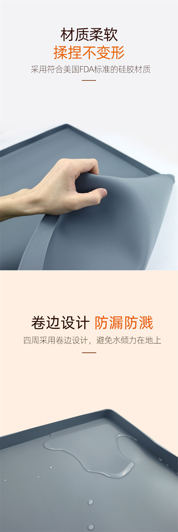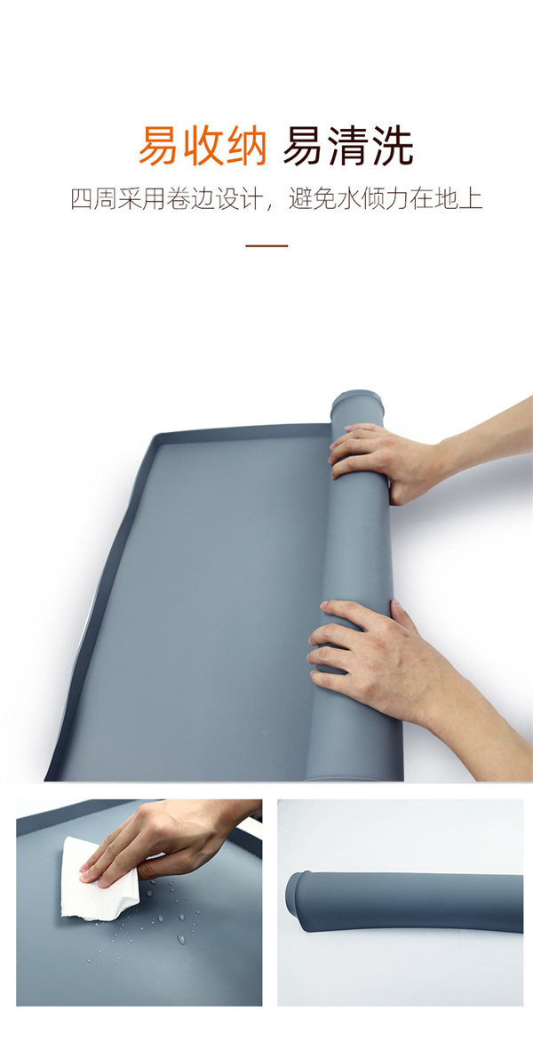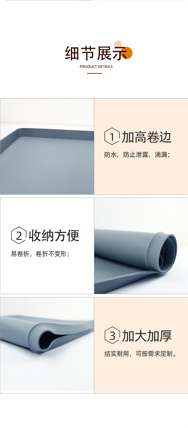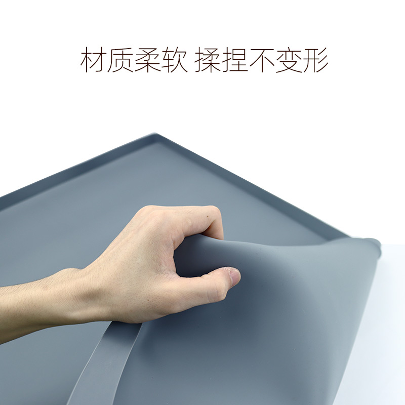 硅膠水槽墊可以在多個不同環(huán)境情況下正常使用,產(chǎn)品不僅可以用于下水槽隔水使用,也可以用于家居防滑腳墊以及廚房洗手臺物品收納擺放作用,硅膠材質(zhì)特性特殊,具備一定的防滑效果和隔熱功能,外圍一圈為擋墻,可以戶外進(jìn)行物品擺放以及高低溫存放,便于收納以及折疊攜帶等